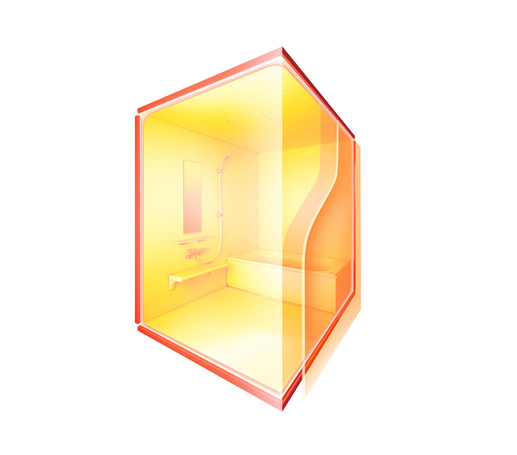 天井、壁、浴槽エプロン、フロアの裏側まで、浴室全体を分厚い保温材でパック。入浴後30分経過しても20℃以上をキープする高い保温性を実現し、寒い日でも暖かい空間を省エネで維持します。高断熱浴槽と合わせ、ご家族の健康を守ります。